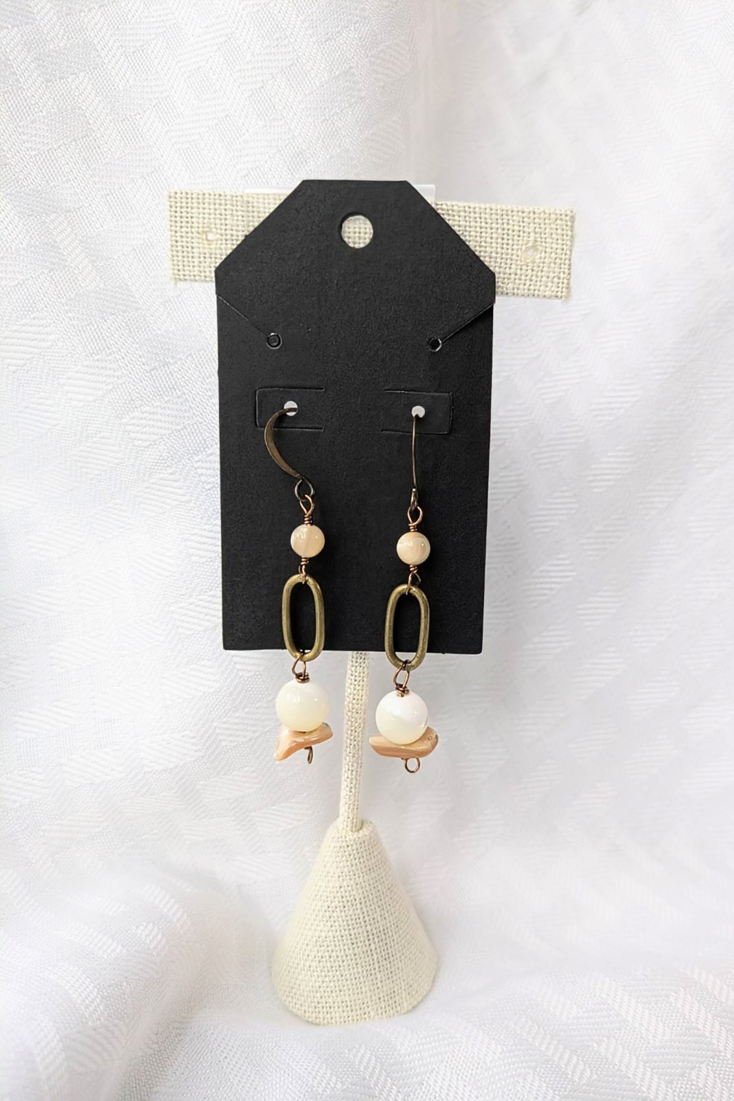In this unique design each Earring has two Mother of Pearl beads, in shades of white to tan and colors in between. The bead at the top is approximately 5mm in size brought together with a brass link, the bottom bead is approximately 8 mm in size and sits on an Abalone chip. All have an iridescent quality to them and can look different depending on how the light shines on them. The length from the bottom of the ear wire to the bottom of the earring is approximately 1 3/4" .