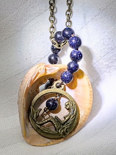 This sweet Brass Mermaid nestles herself inside this seashell. There are 12 Blue Goldstone beads (4-5mm). And one 6 mm Blue Goldstone bead. The brass chain is approximately 17" long with a 1" extender and is finished off with three 4 mm Blue Gold stone beads. The blue color of the beads contrast nicely with the tan, brown and orange colors of the shell and Mermaid charm.