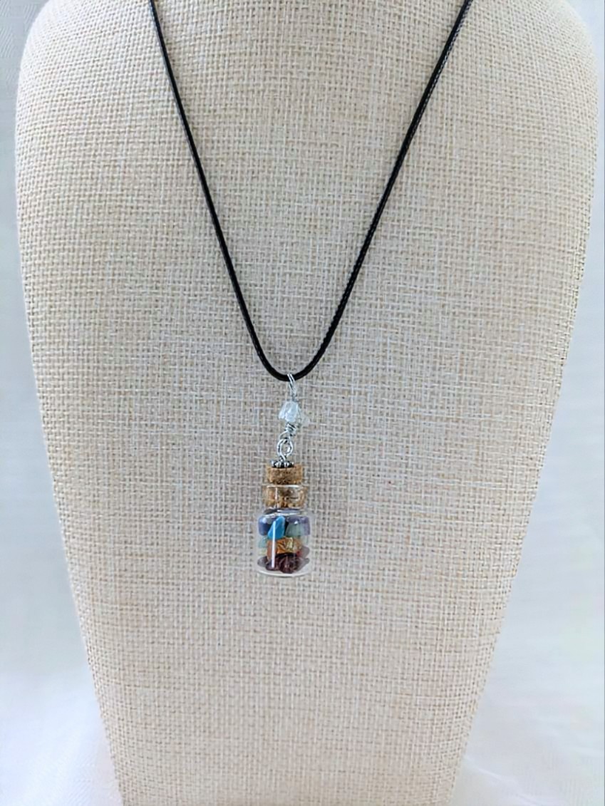 This cute little bottle has gemstones that represent the colors of the chakras: Amethyst, Lapis Lazuli, Apatite, Green Aventurine, Citrine, Carnelian, and Garnet.