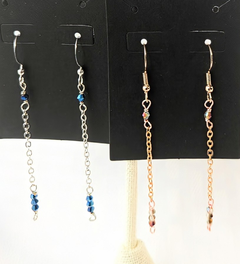 These Crystal Earrings are both lightweight and elegant. For both earrings the length from the bottom of the ear wire is approximately 2". The first pair offers three stacked crystals (2-3 mm) at the bottom of the silver plated chain with one crystal at the top. The other pair showcases iridescent crystals in muted colors of pink, green and champagne. They dangle from a rose gold colored chain.
