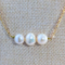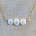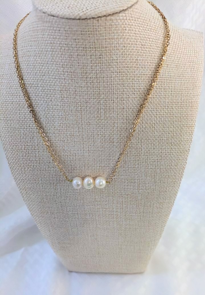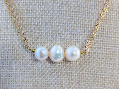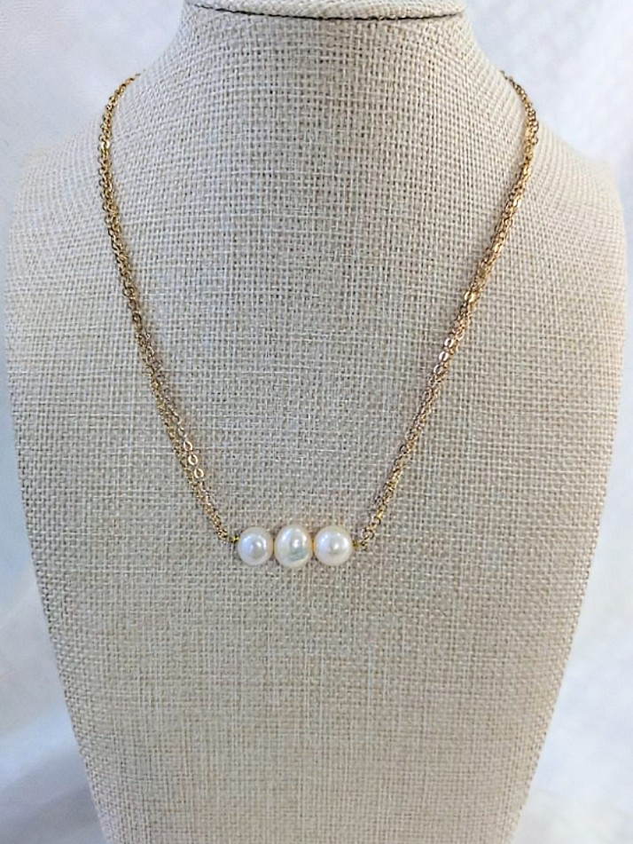 Gorgeous natural freshwater pearl trio necklace. These freshwater pearls hold so much natural beauty in variation of size and color. They are approximately 8-10mm each in size. The variation in color blends from white to yellowish and pinkish hues.