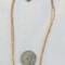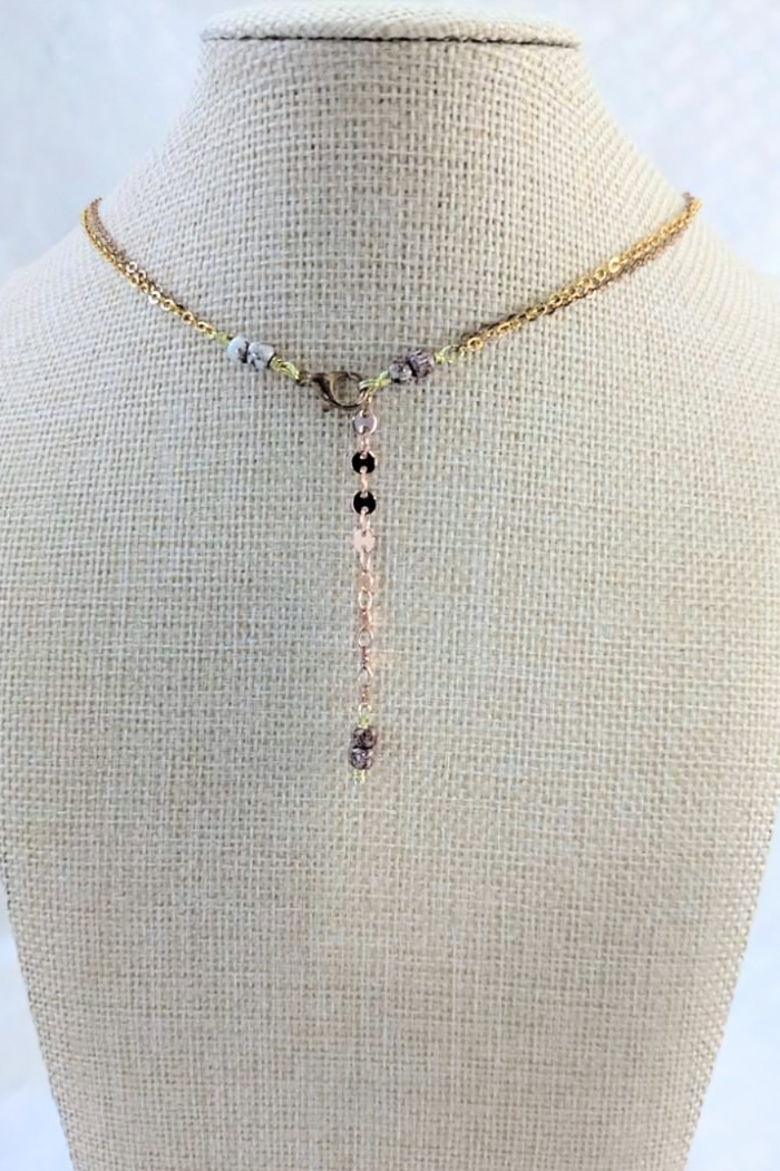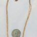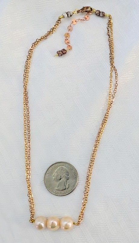 They are strung on two 1 mm size chains. One gold-plated and one rose gold plated, to pick up the different shades of the pearls. The necklace is (approximately) 16" inches in length with a 1" inch extender and a lobster claw clasp. The chain is finished with glass seed beads.