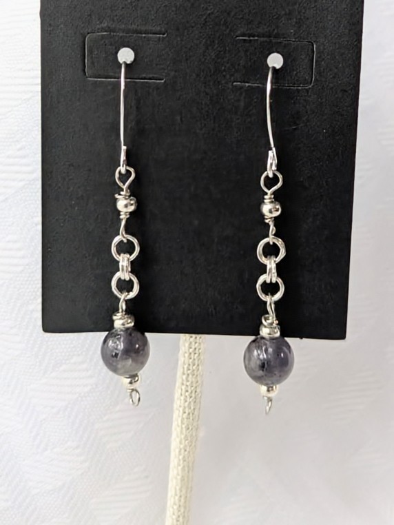 A single Iolite bead (6mm each) dangles from a plated silver chain with double links. The length of the earring from the bottom of the ear wire is approximately 1 1/4". This design is finished with glass seed beads.