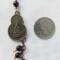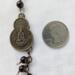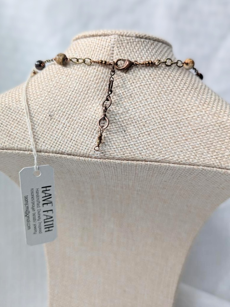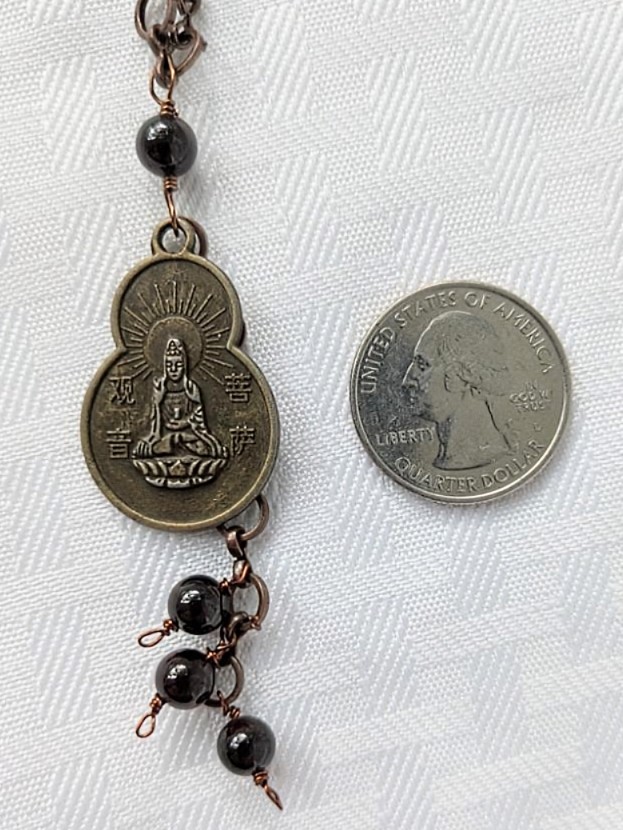 This one of a kind brass coin Quan Yin necklace offers a beautiful contrast between high quality Garnet and Jasper beads (all approximately 6 mm in size). This brass coin is double-sided with an image of Quan Yin on one side and Sanskrit writing that means "Peace and Safety." The coin is approximately 1 1/4" in length and 3/4" wide at its widest point. Three Garnet beads dangle from the coin, while another is used to create the bail. There are 12 Garnet beads in total and 10 Jasper beads. They are linked together with copper and brass chain in various link sizes. This necklace is approximately 17" in length with a 1" extender.
