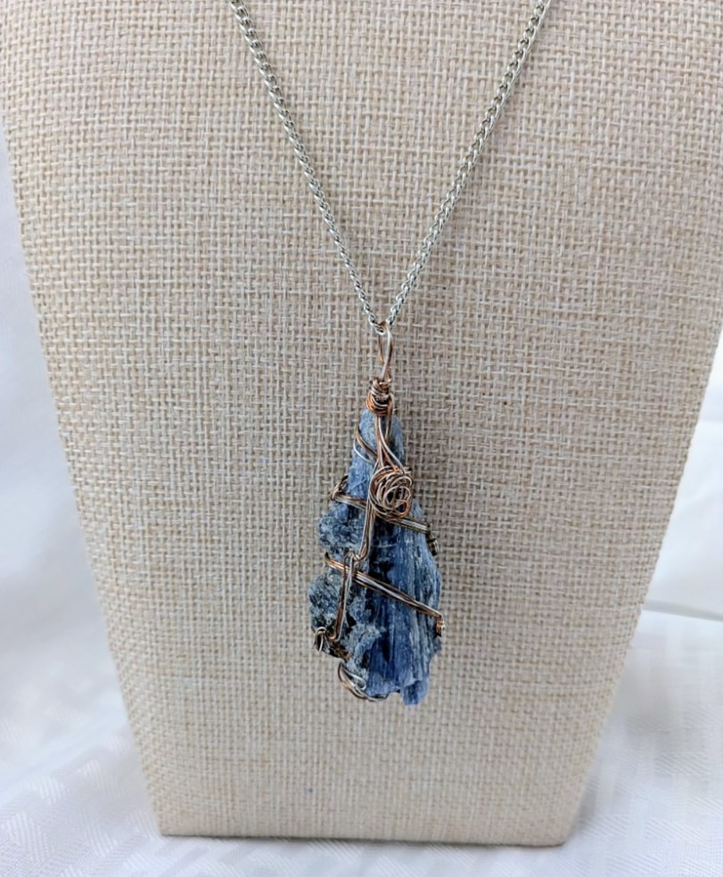 Kyanite is one of the most attractive blue minerals in nature, the copper wire wrapping adds unique detail and design.