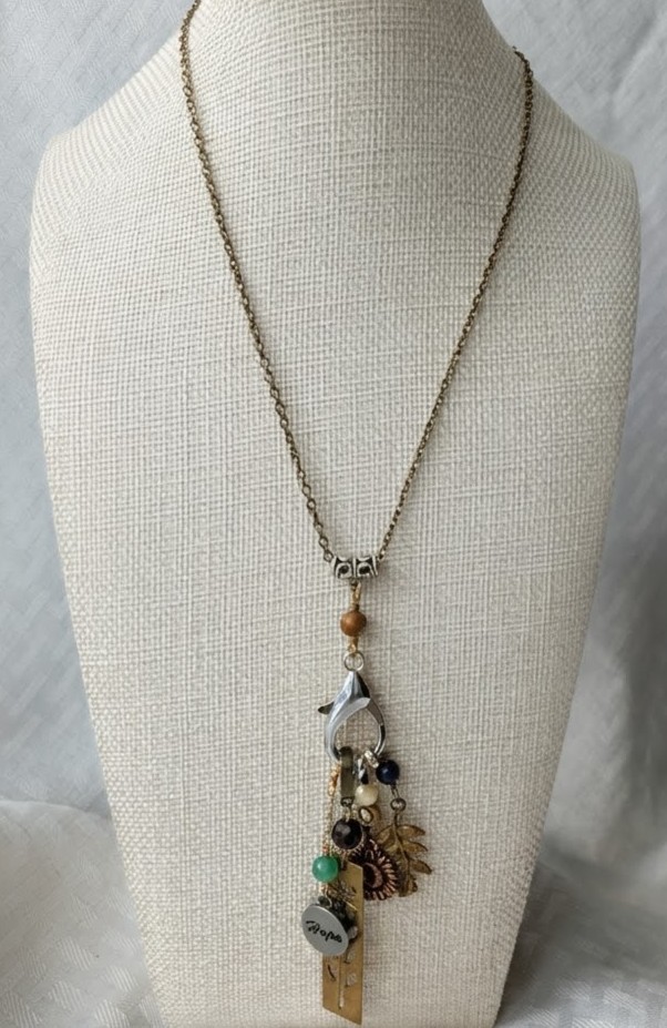 The pewter bail is embellished with an open cut design. The chain is brass and is approximately 28" long with a 1" extender and is finished with seed beads.