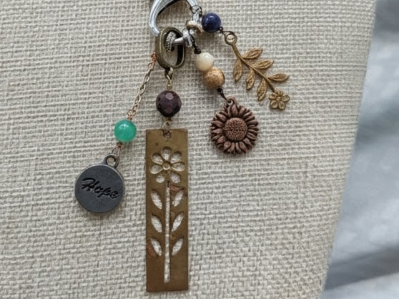 The brass rectangular flower with cutout design is approximately 2" long and 1/2" wide. The copper sunflower charm is approximately 1/2" in diameter. The brass flower charm with leaves is 1 1/4" long. All are suspended from a silver plated lobster claw clasp and can be changed in order.