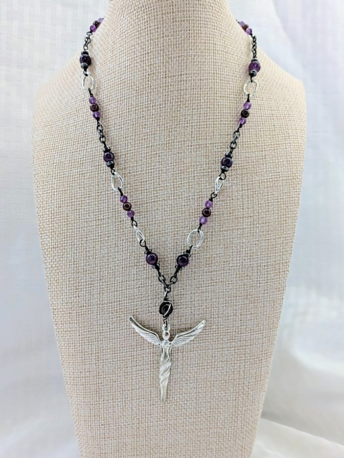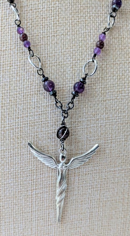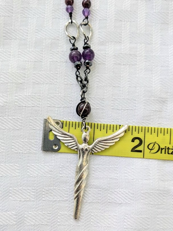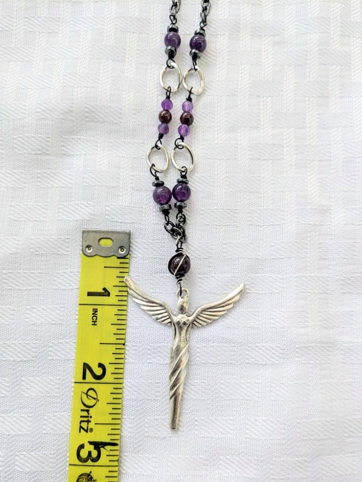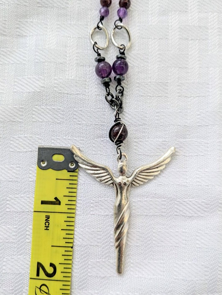 This beautiful goddess is silver plated, and contrasted by the different color tones in the chains and gemstones. The bail is a wire wrapped Garnet bead (8mm). Different size/lengths of links connect 12 faceted (4mm) Amethyst beads, 6 round Garnet beads accented with 6 (6mm) Amethyst beads and 12 Hematite rondelles. The chain is finished with three Hematite tube shaped beads. The necklace is approximately 17" long with a 2" extender chain.