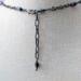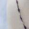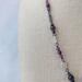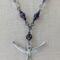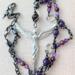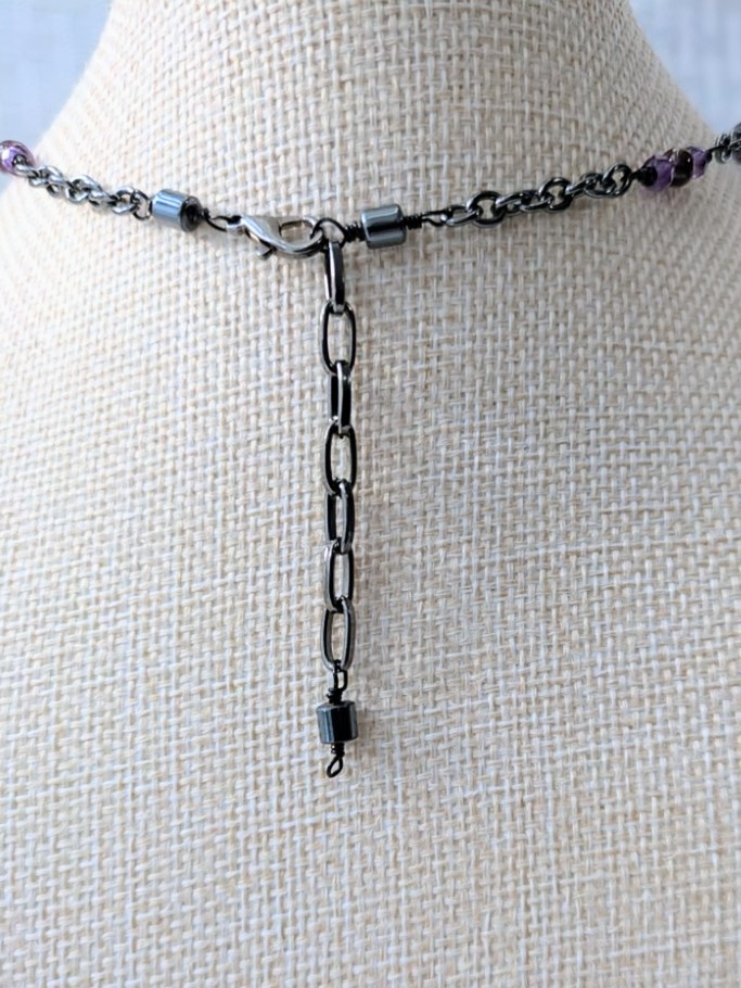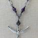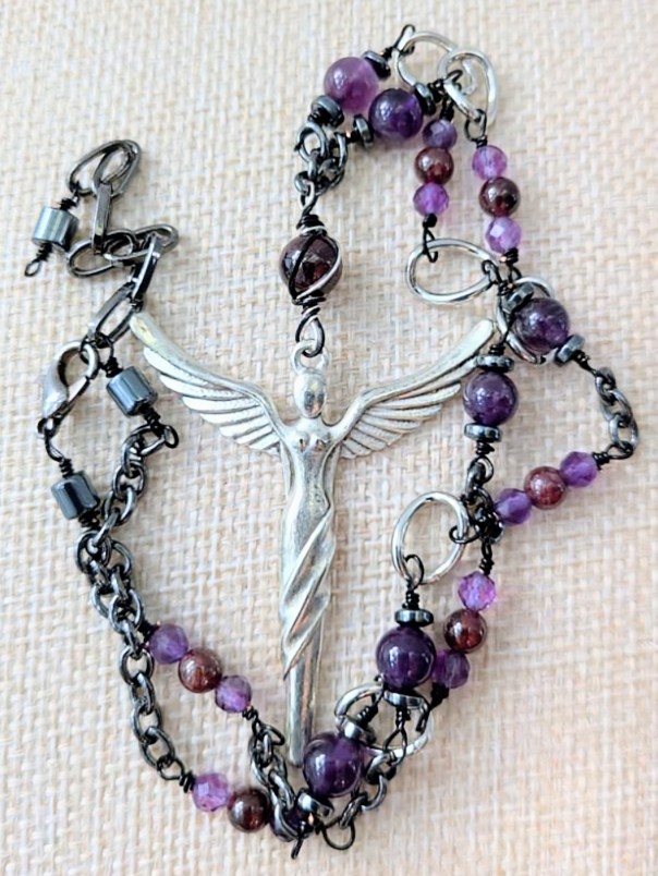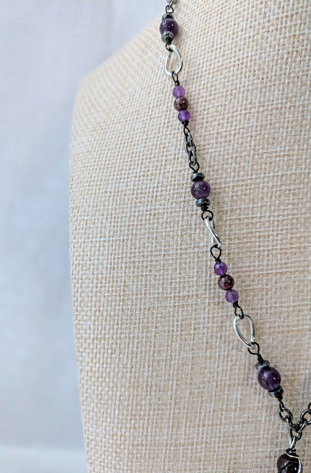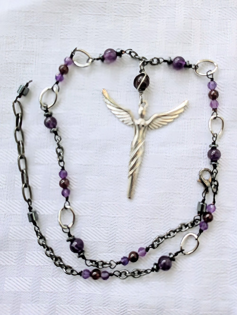 This beautiful goddess is silver plated, and contrasted by the different color tones in the chains and gemstones. The bail is a wire wrapped Garnet bead (8mm). Different size/lengths of links connect 12 faceted (4mm) Amethyst beads, 6 round Garnet beads accented with 6 (6mm) Amethyst beads and 12 Hematite rondelles. The chain is finished with three Hematite tube shaped beads. The necklace is approximately 17" long with a 2" extender chain.