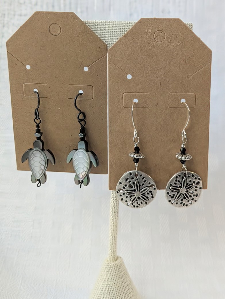 Sea Turtle Earrings are made of shell and are accented with glass seed beads and a hematite bead at the top. The length from the bottom of the ear wire to the bottom of the turtle is approximately 1 1/4" long. The metal Sand Dollar earrings are approximately 3/4" in diameter and are finished with a metal bead and two tiny crystal beads at the top. The length from the bottom of the ear wire is approximately 1 1/4". Both earrings are very lightweight.