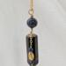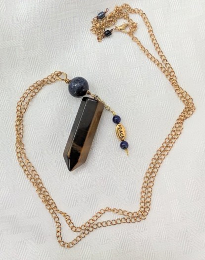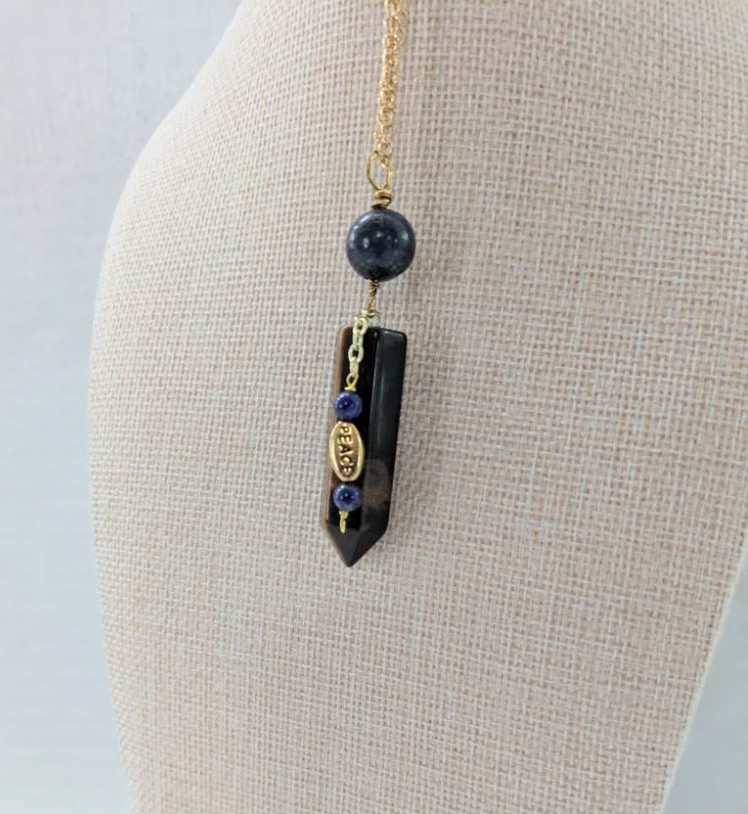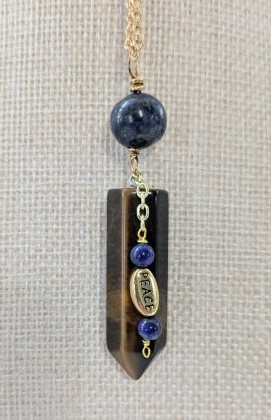 in length and approximately 2.5 inches from the top of the bail. Two (4mm) Lapis Lazuli beads and a double-sided "peace" charm dangle from the bottom of the bail.