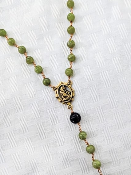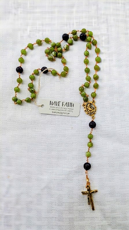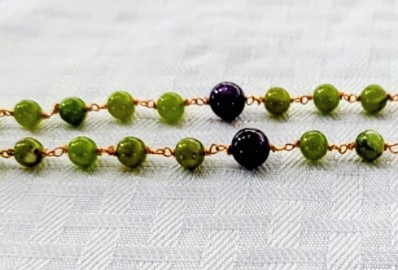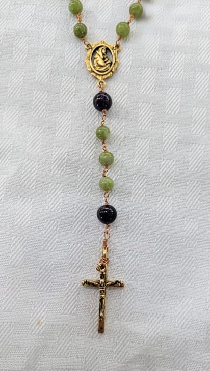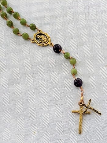 Green Garnet and Amethyst are the gemstones that grace this Traditional Catholic Rosary.