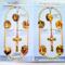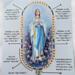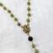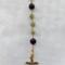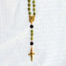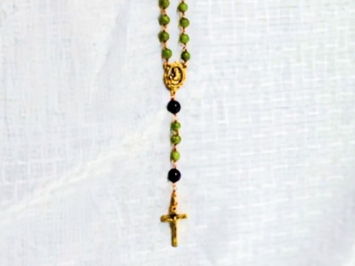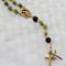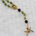 Copper color wire joins the beads with a gold color centerpiece representing the Virgin Mary (double-sided). There are two crosses, one is plain and almost an inch and a half in length with a smaller crucifix resting on top of it. The crucifix and centerpiece are gold-plated.